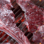 Corte a peça de picanha em bifes de aproximadamente 3 centímetros e espalhe o sal grosso nos dois lados dos bifes.
